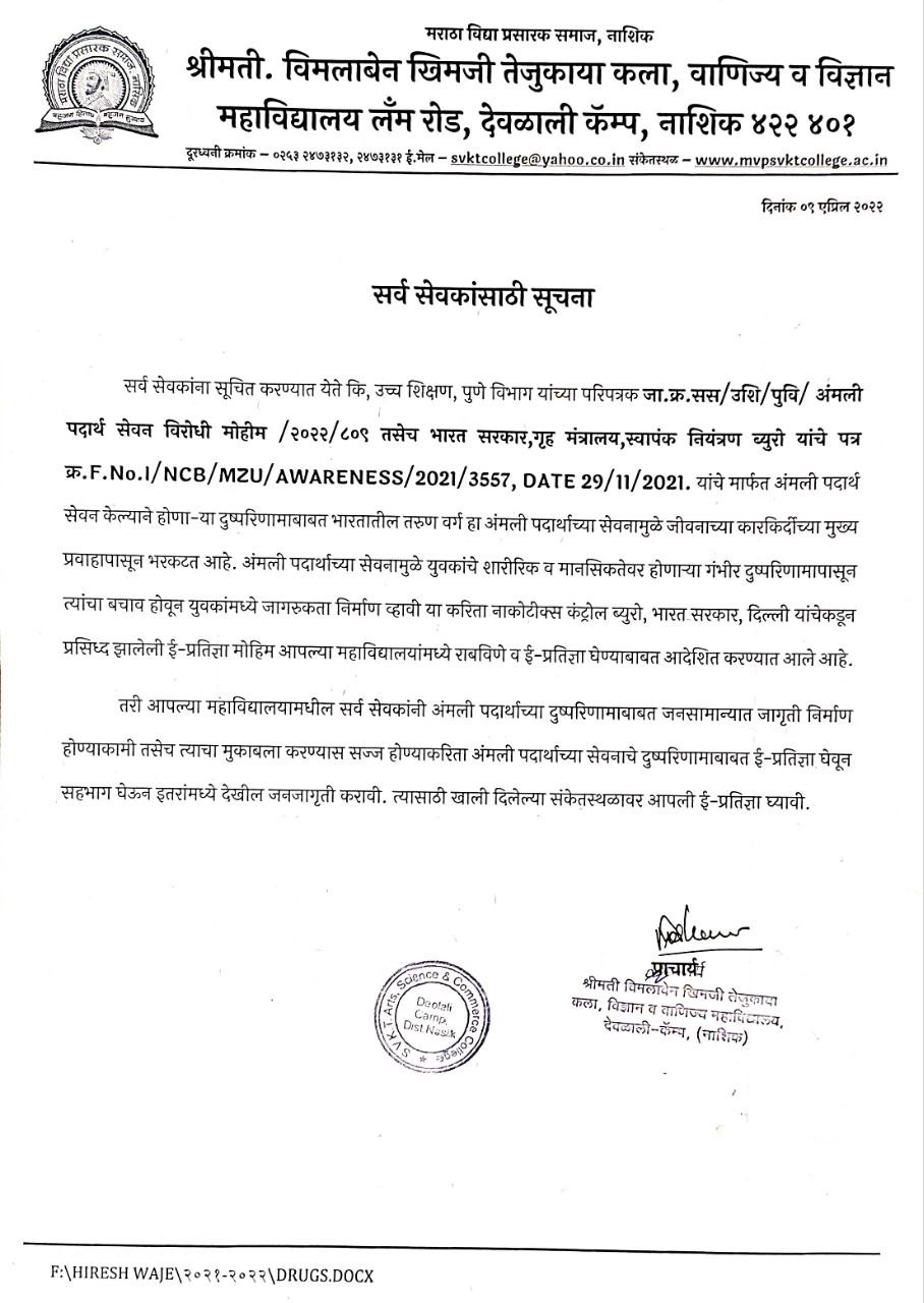 UncategorizedApril 11, 2022 अंमली पदार्थाच्या सेवनाचे दुष्परिणामाबाबत ई-प्रतिज्ञा आपली प्रतिज्ञा नोंदविण्यासाठी येथे क्लिक करा. आपली प्रतिज्ञा नोंदविण्यासाठी येथे क्लिक करा. Related posts International Yoga Day -2025College Celebrated Maharashtra Din and…Categorywise and minoritywise Admission Report…Eligibility Numbers 2023-2024Eligibility Numbers 2022-2023Eligibility Numbers 2021-2022Eligibility Numbers 2020-2021Eligibility Numbers 2019-2020Criteria 1 to 7M.Sc.-II (2019 Pattern) Micro-I Exam…