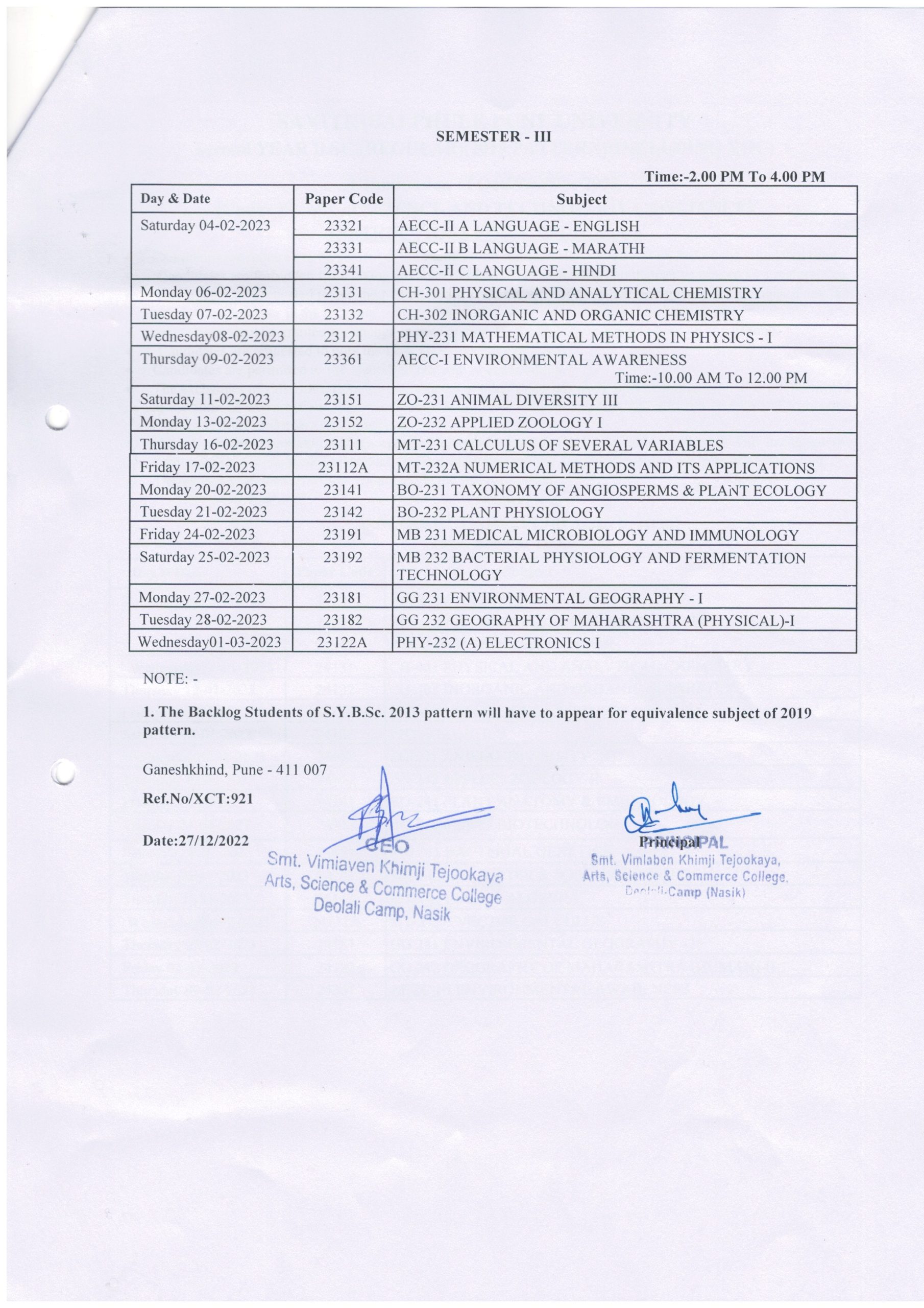 Scrolling NewsDecember 29, 2022 S.Y.B.Sc. (2019 Pattern) Exam Time Table Oct.-2022-23 Related posts BCA Institute level Admission List…हिंदी दिवस २०२५जल्लोष युवक महोत्सव २०२५Tree Plantation by NSS Students…Commercial Pilot License Workshop by…International Yoga Day -2025मुलींना मोफत शिक्षण परिपत्रकCollege Celebrated Maharashtra Din and…College celebrated Dr. Babasaheb Ambedkar…EXAM FORM NOTICE BA (2019…