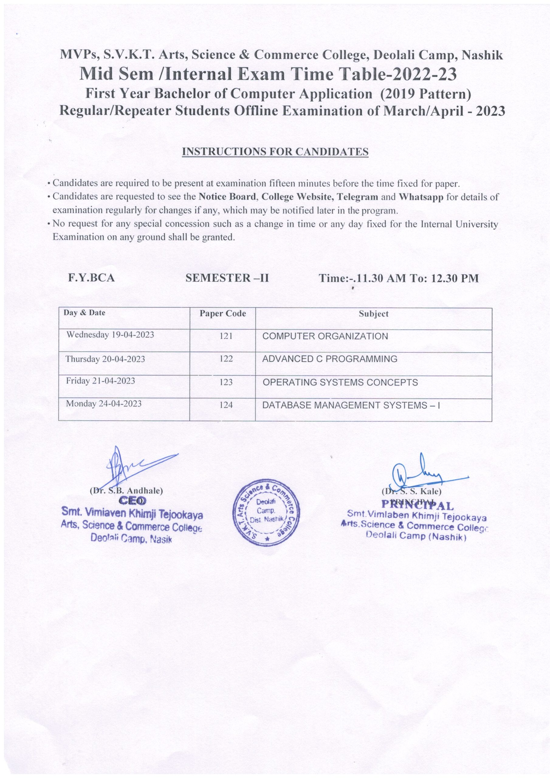 F.Y.B.C.A. Sem-II Internal Exam Time Table March/April-2022-23