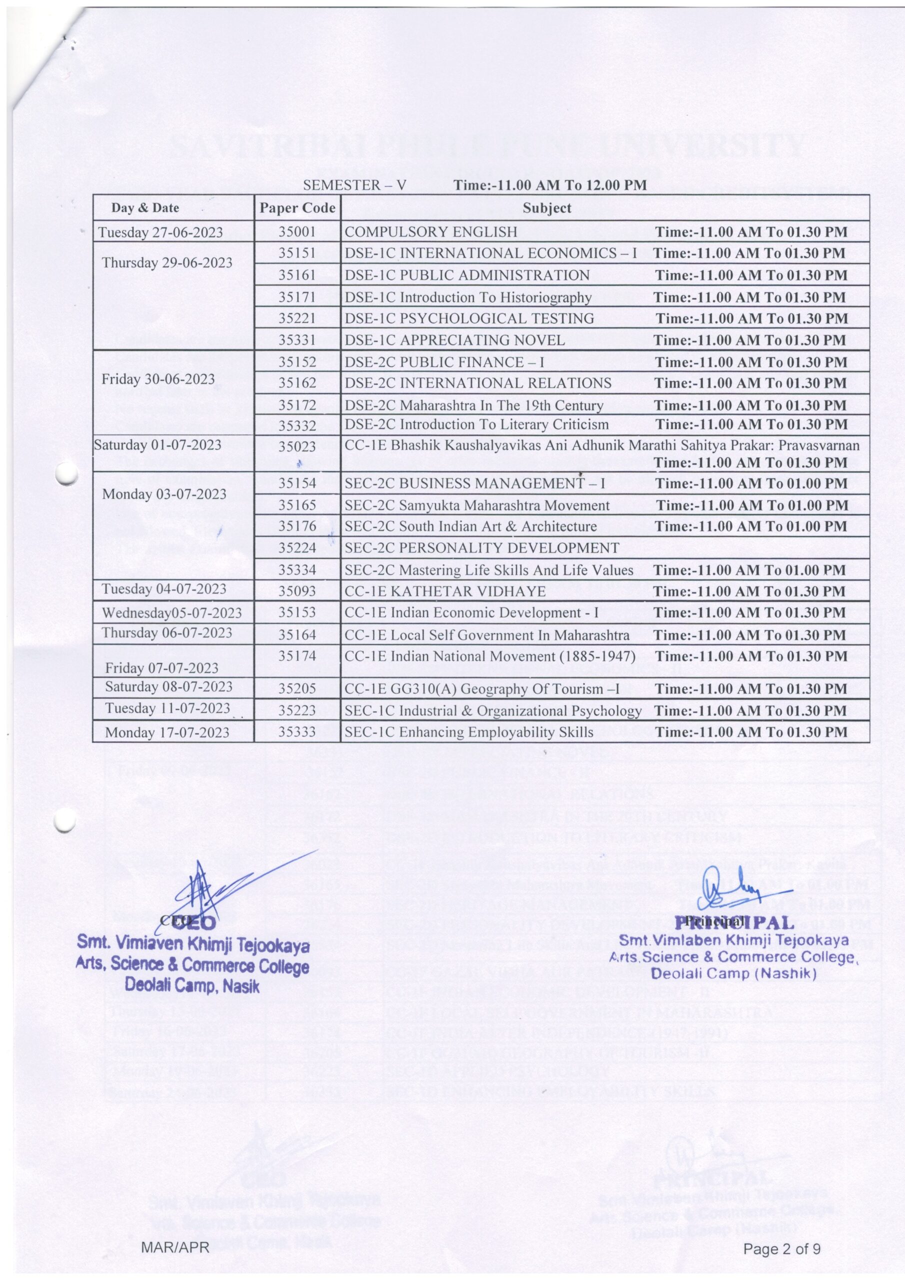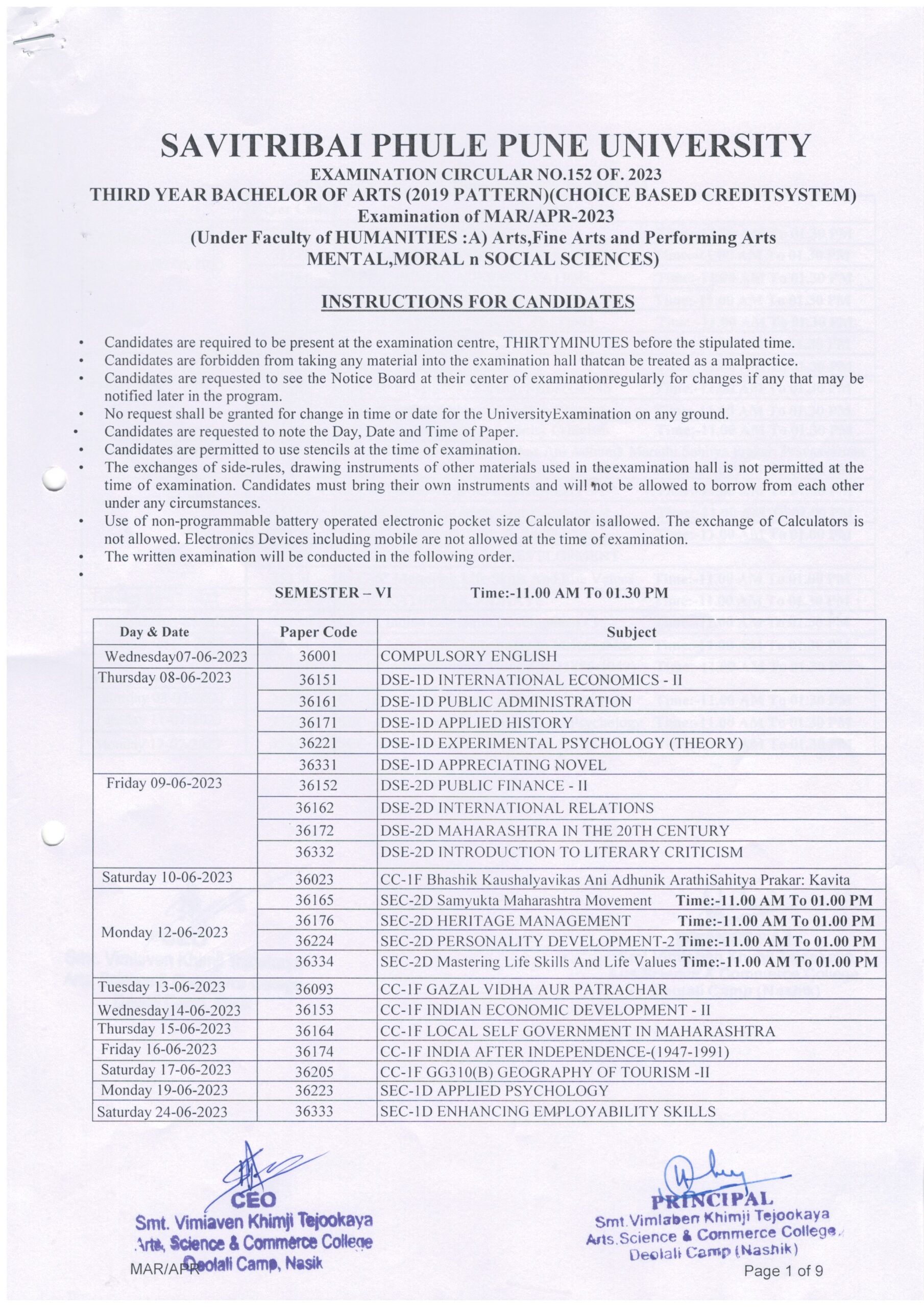 /T.Y.B.A. (2019 Pattern) Exam Time Table March/April-2022-23